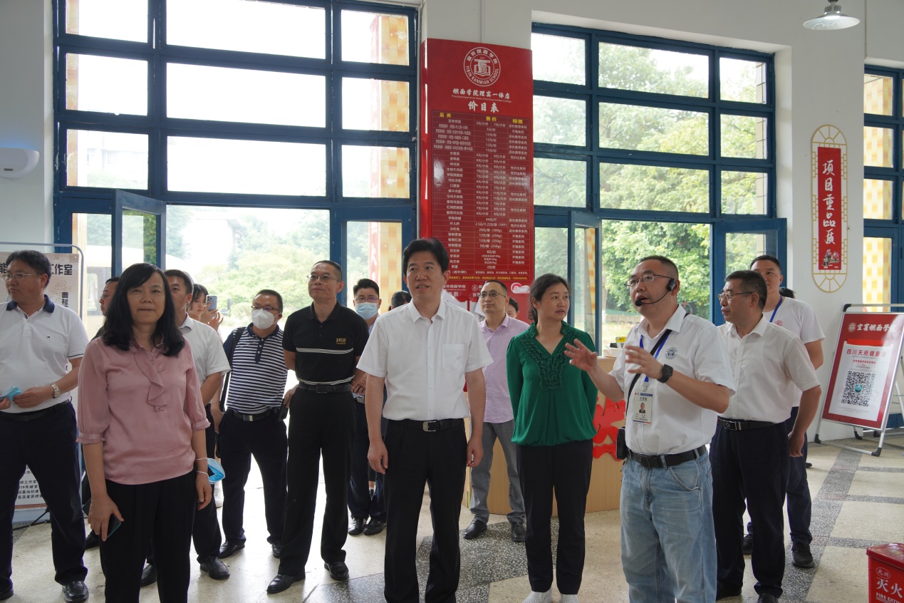 王秀江一行深入现场考察调研了我院冬水田研究院、宜宾燃面学院、白酒虚拟仿真实训基地、工业机器人实训室(博士工作室)等实验实训场所,认真听取了我院实验实训场所建设及管理情况介绍,对我院实验实训场所建设及管理运营状况大加赞赏。