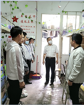 2022年4月28日下午,学院党委常委、副院长江仁朝带队深入交通学院学生寝室,检查学生寝室文化建设情况。保卫处处长李强、副处长黄巨强、保卫科科长曾金、宿管中心主任温锴和交通学院党总支书记高永贵、副书记覃登攀、学生科科长李黎参加了检查。