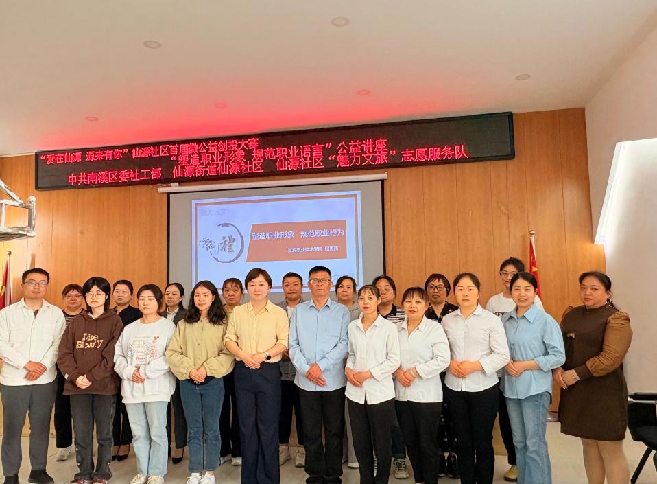 4月11日下午,“塑造职业形象 规范职业语言”主题培训在仙源社区二楼公共空间举行,仙源社区工作人员、社区网格员等二十余人参加了活动。此次培训着重从社区工作人员的岗位职责、岗位形象要求入手,对标职业的仪容仪表仪态,语言行为规范,结合会议组织管理的实训实操项目,采用角色扮演、情景模拟的手段,将工作场景与礼仪知识结合开展教学。活动现场,气氛活跃,积极互动,授课老师用生动形象的语言倡导社区工作人员爱岗敬业,服务辖区居民。
