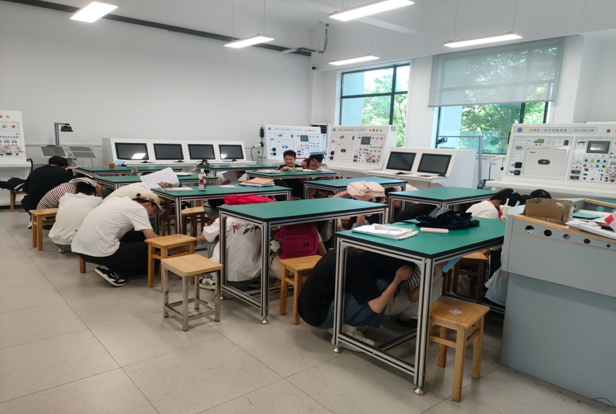 当天下午,新电学院模拟突发地震场景,组织学生开展应急疏散演练,参与人员在学院统一指挥下迅速避险、有序撤离至安全区域,演练过程紧张高效。