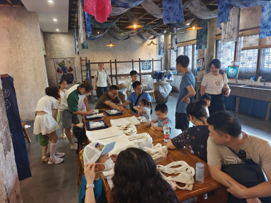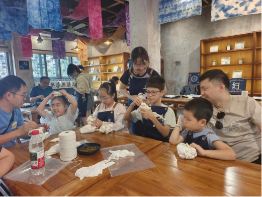 实践环节将活动推向高潮。在导师指导下,家长与孩子共同设计图案,一方白巾经绳结扎缚、浸染定色,逐渐幻化出星辰、海浪等创意纹样。孩子不仅学会了扎染技法,更在协作中理解了“匠心”的深意。现场欢声笑语交织,蓝白相间的作品铺展成独特风景。