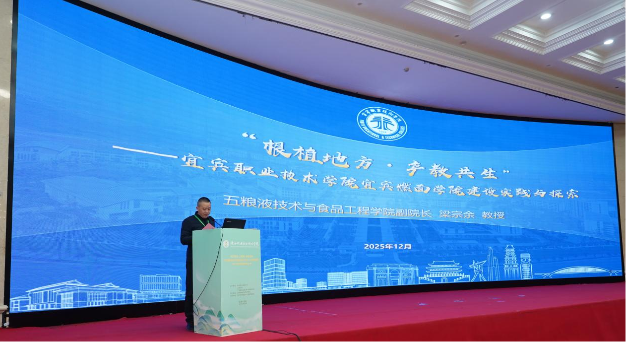 五粮液技术与食品工程学院副院长梁宗余围绕“根植地方 产教共生”作主题报告,聚焦产教融合,结合我校办学特色,从人才培养体系构建、科研创新平台共建、燃面标准制定、非遗技艺活态传承以及技状元品牌的产业实践等方面分享经验。