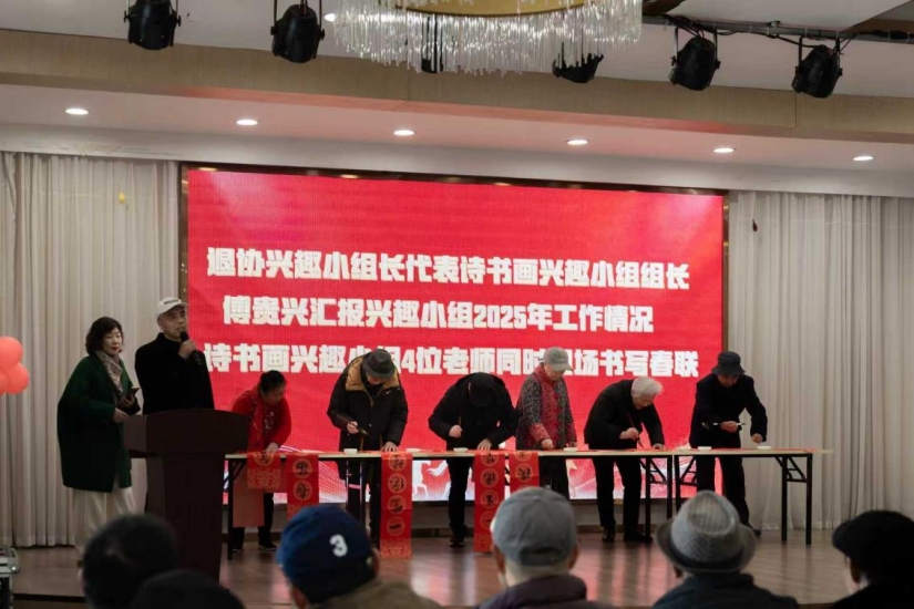 活动伊始,学校宣传片全景展现了校园建设与事业发展提质增效的最新成果,让老同志们直观感受学校发展新面貌。随后,退协理事会负责人、退协小组长及兴趣小组组长代表依次汇报2025年工作开展情况,诗书画兴趣小组教师现场挥毫泼墨,书写春联福字赠予在场老同志,为团拜会增添了浓厚的新春文化气息。活动中与会校领导依次为70岁、80岁、90岁的28名退休教职工寿星送上礼金、鲜花与诚挚祝福。寿星代表赖德光发言时,深情抒发了对学校的感恩之情与深切眷恋。