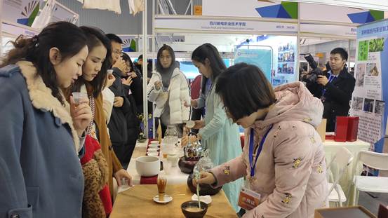 院校展区内,省内各级职业院校组团亮相,全方位、多角度地展示四川教育风采。我院采用图文、实物、视频等形式展示了学校的办学成果和办学特色。茶叶专业学生在现场进行茶道表演,酿酒专业学生在现场进行白酒勾调表演。我院展位上人气旺盛,参观者纷纷驻足并饶有兴趣地与我院参展师生进行茶和酒文化交流。四川省教育厅副厅长张澜涛莅临我院展位参观指导并给予充分肯定。