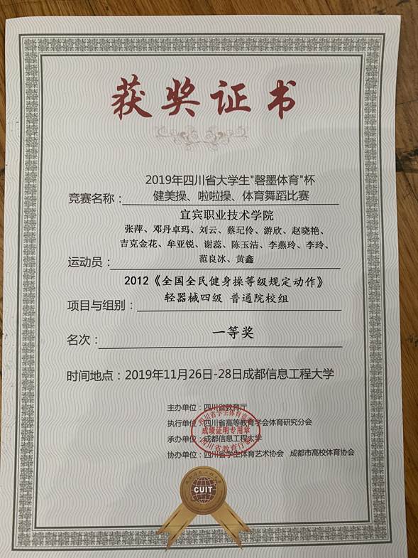 我院“三操”竞技队于2019年11月26-28日参加2019年四川省大学生“磬墨体育”健美操、啦啦操、体育舞蹈比赛。本次比赛由四川省教育厅主办,四川省高等教育学会体育研究分会执行,四川省学生体育艺术协会、成都市高校体育协会协办,成都信息工程大学承办。我院健美操代表队获得普通高校组轻器械四级第一名,体育舞蹈代表队队员陈琴获得体育舞蹈单人单项拉丁舞第三名,单人两项拉丁舞第四名。