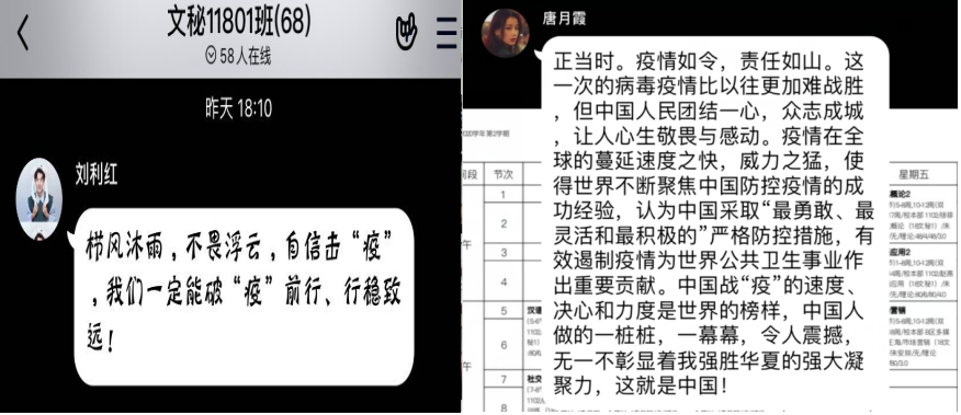 本次“全国大学生同上一堂疫情防控思政大课”线上直播活动在我院师生中引起巨大反响和强烈共鸣,广大师生深受感染和鼓舞,自发在线上展开热烈讨论。大家纷纷表示,此次线上思政大课意义重大、讲解精彩、触动心灵、正能量满满,观看学习后思想灵魂受到洗礼,收获颇多。