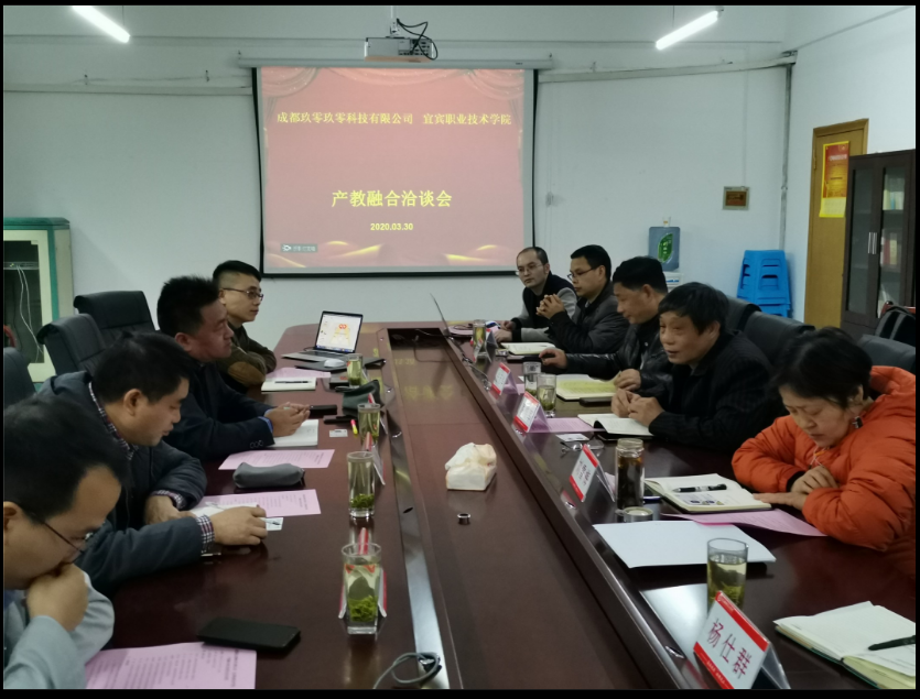 在办公楼308室,副院长周黎军对成都玖零玖零科技有限公司董事长伍迎久一行的到来表示热烈欢迎,然后详细介绍了学院办学历史、办学理念、发展状况,特别是几年来学院在产教融合、校企合作、现代学徒制等所取得的系列成绩,希望与成都玖零玖零科技有限公司加强现代学徒制合作,共育人才。
