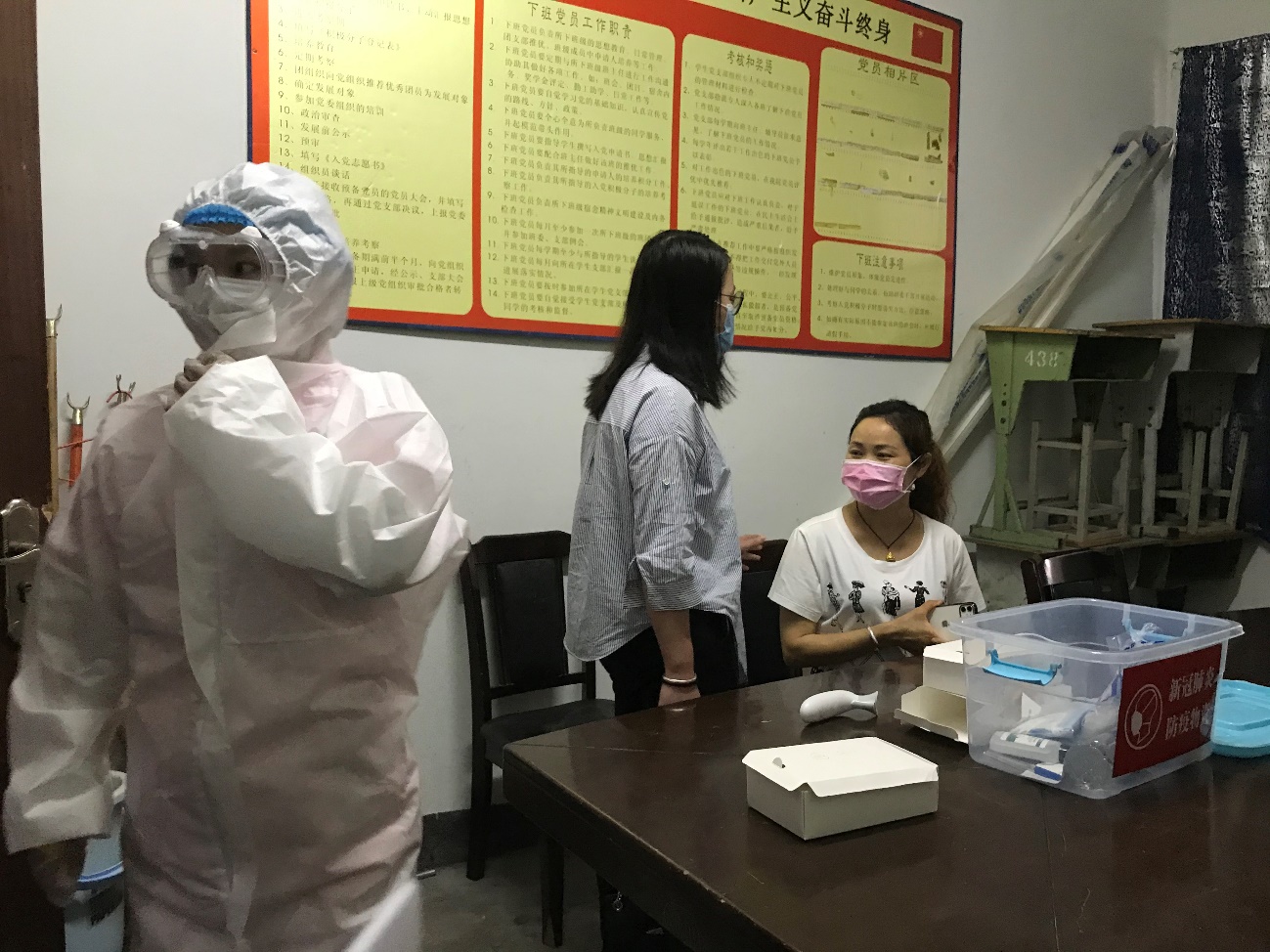 在演练过程中,模拟体温超过37.3℃的学生及时转移到临时留观区,并用水银温度计进行二次体温检测,同时立即拨打二级学院24小时防疫专线并通知辅导员立即赶到现场安抚学生。