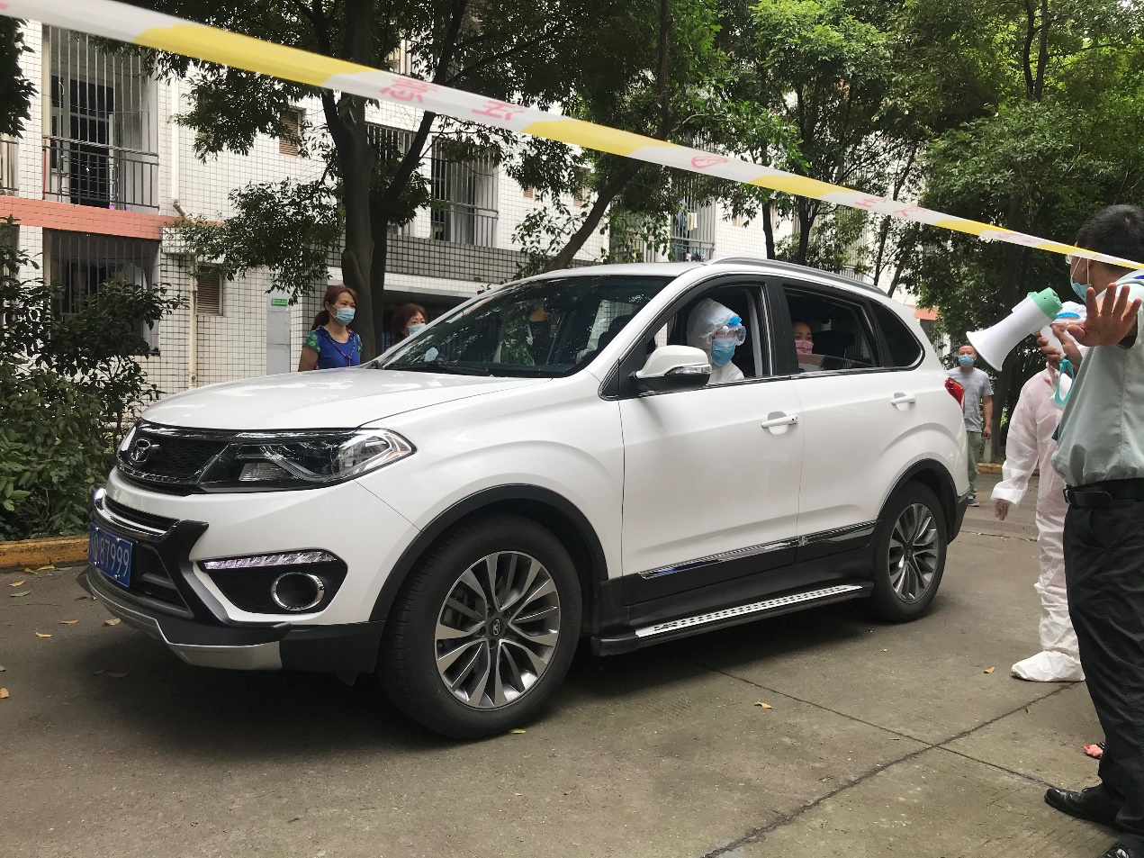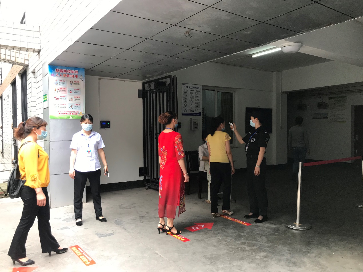 下午3时,应急演练有序推进。演练人员按照间隔一米的距离依次排队测量体温后进入宿舍。
