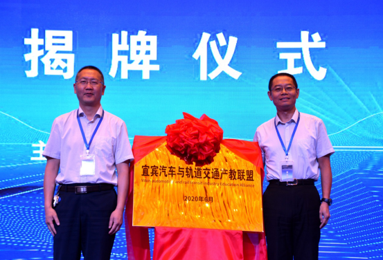 会上,由宜宾市教育和体育局副局长郎红和宜宾职业技术学院院长伍小兵共同为宜宾汽车与轨道交通产教联盟揭牌。
