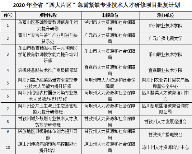 开展全省“四大片区”急需紧缺专业技术人才研修项目,是四川省人社系统为推动精准扶贫、精准脱贫落地见效,以人才扶贫、智力扶贫助力“四大片区”脱贫攻坚的重要举措,对加快当地特色优势产业发展、引领扶贫人才队伍建设等方面起着十分重要的作用。该计划面向全省“四大片区”12个市(州)广泛征集研修项目,总共只有10个名额。