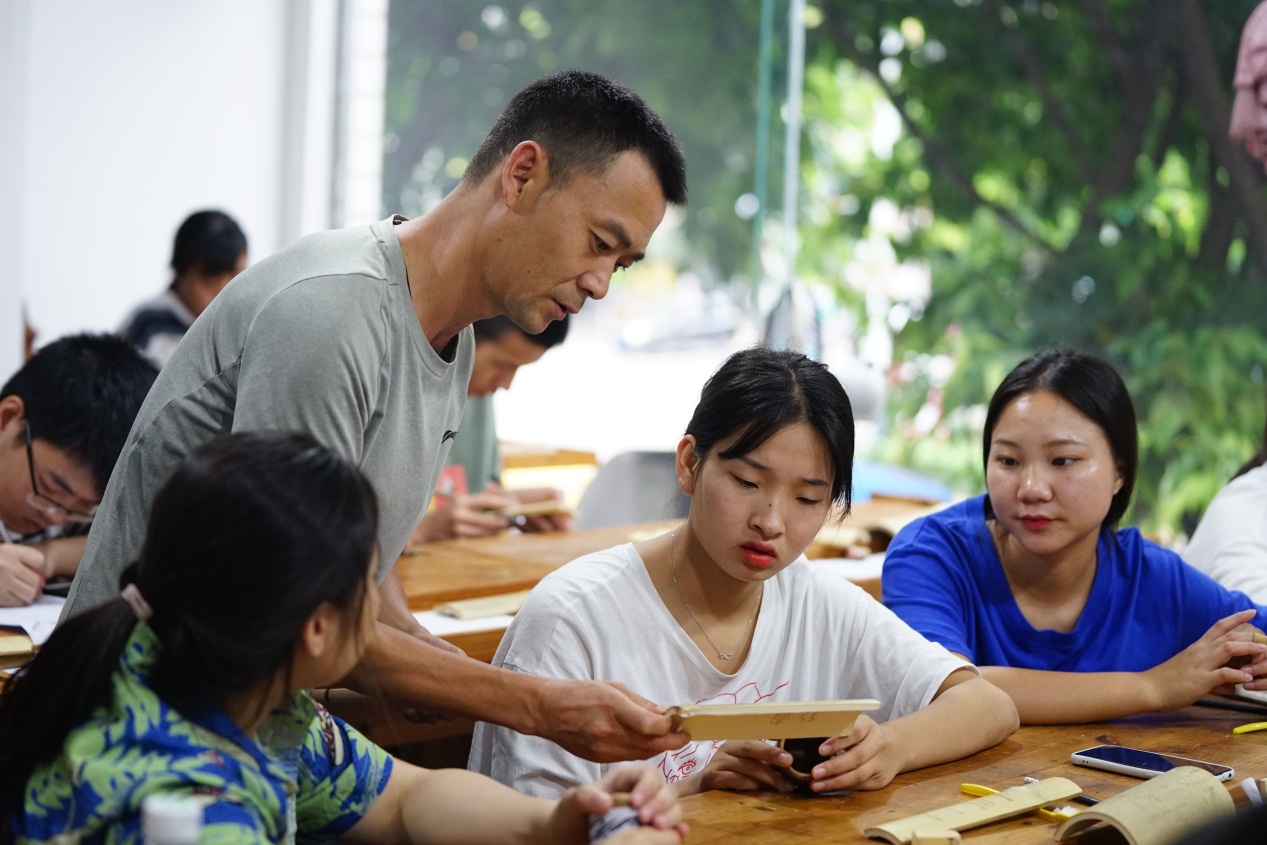 在传习环节,学生们在老师的带领下,系统学习了刀具选择、使用方法、并在竹片上练习起、承、转、合的雕刻基本功。何老先生基于对学生的喜爱,亲自上阵,示范如何起稿、雕线的基本技法,并对学生的作品逐一点评。