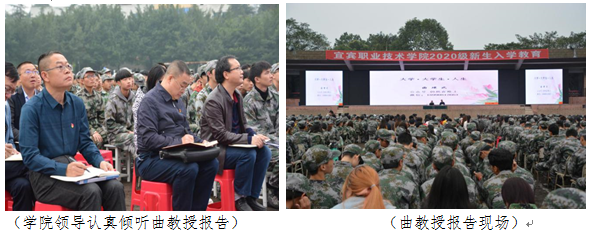 10月25日上午,宜宾职业技术学院2020级新生入学教育第一课在B1区田径场举行。学院党委副书记、院长伍小兵,党委委员、组织部长江仁朝以及二级学院书记、院长、副书记、学管办主任、马克思主义学院全体老师、学保团全体老师、全体专职辅导员参加大会。大会邀请时代楷模、全国师德标兵、全国高校辅导员年度人物、全国优秀教师、全国诚实守信模范、最美奋斗者、大连海事大学教授、宜宾职业技术学院特聘教授曲建武同志作 “大学·大学生·人生”的专题讲座。学院党委副书记、院长伍小兵主持大会。