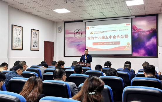 林世全全文领学了《中国共产党第十九届委员会第五次全体会议公报》。他指出,党的十九届五中全会是在我国将进入新发展阶段、实现中华民族伟大复兴正处在关键时期召开的一次具有全局性、历史性意义的重要会议。要把学习贯彻十九届五中全会精神作为当前和今后一个时期的首要政治任务,按照学院党委统一部署,结合学院实际,在全院广大教师中迅速掀起学习宣传贯彻全会精神的热潮,通过发放学习资料、召开专题学习会、“主题党日”及自学等形式,教育引导全体党员干部和教职工认真学习、深刻领会、全面把握全会精神,把学习贯彻全会精神与学院教育教学、重点工作等紧密结合起来,真正把学习成果转化为推动学院新一轮高质量发展的强大动力。