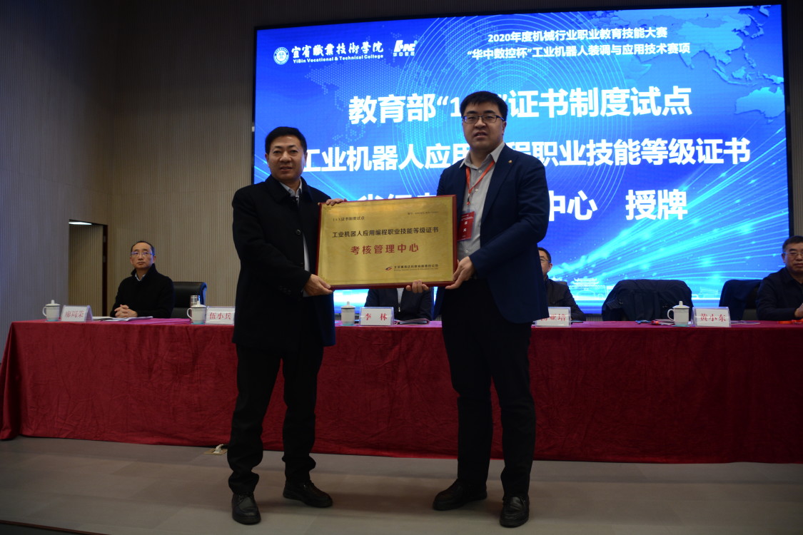 会上,由机械工业教育发展中心产教合作处兼发展研究处处长黄小东授牌,副院长古文伟接牌,举行了教育部“1+X”证书制度试点“工业机器人应用编程职业技能等级证书省级考核管理中心”授牌仪式。