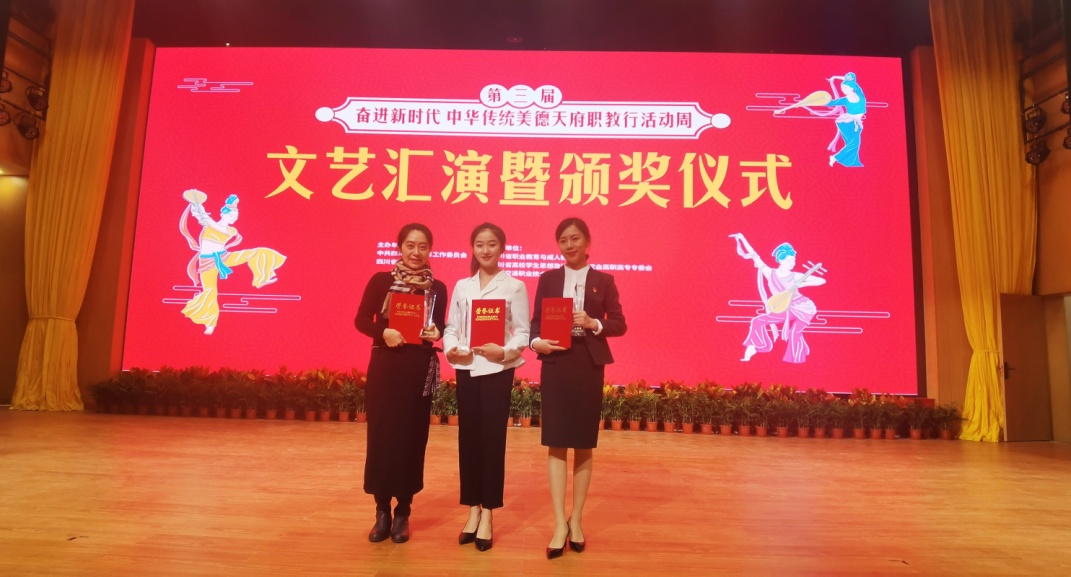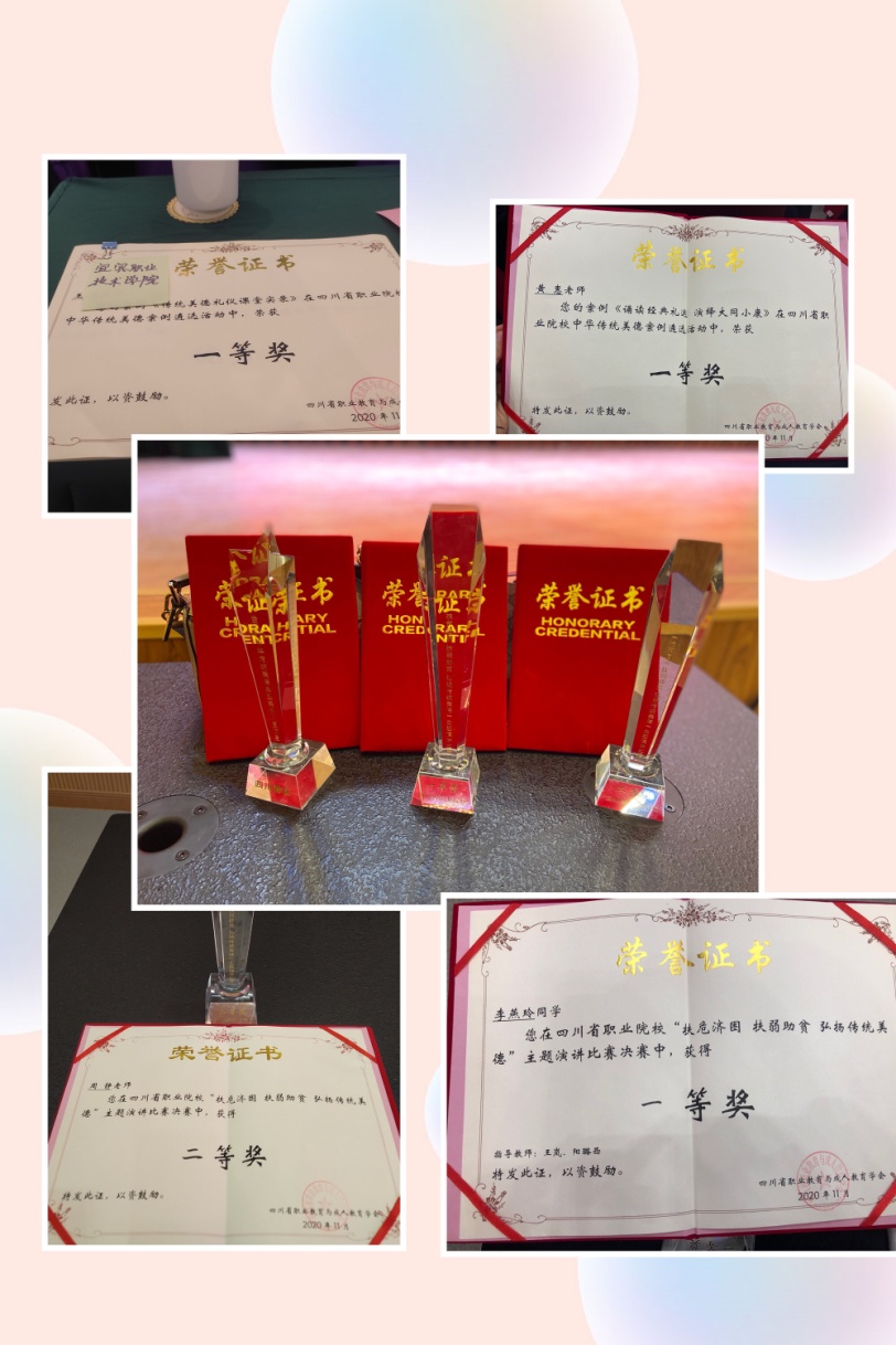 本次活动中,我院师生荣获多个奖项。人文与社会学院申报的《传统美德礼仪课堂实录》(主持人:王岚)与素质教育学院申报的《诵读经典礼运 演绎大同小康》(主持人:黄惠)双双荣获四川省职业院校中华传统美德案例一等奖。在“扶危济困 扶弱助贫 弘扬传统美德”主题演讲比赛中,素质教育学院教师周静获得教师组二等奖,人文学院学生李燕玲获得学生组一等奖。