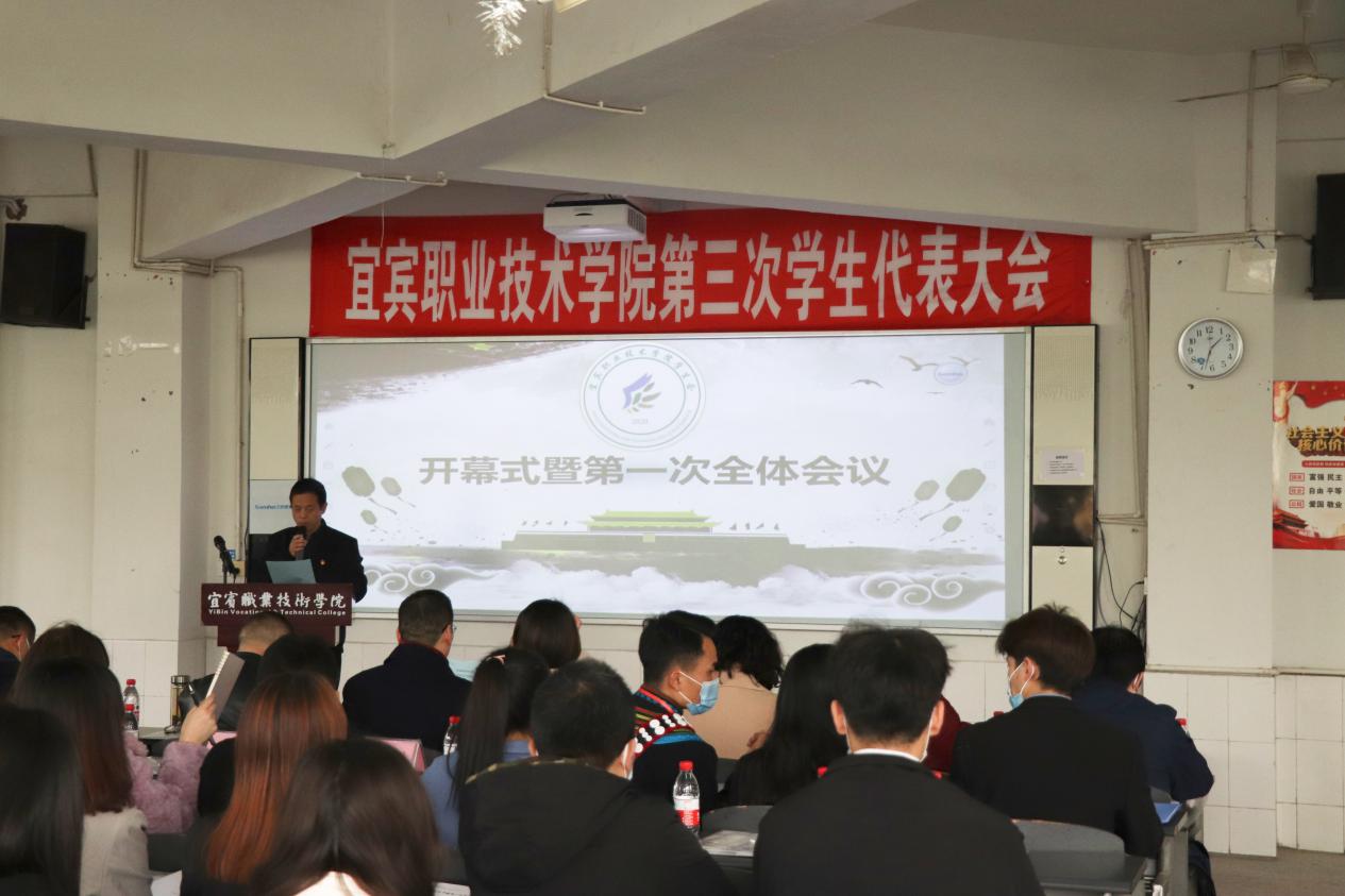 开幕式上,江仁朝致开幕词。他表示宜宾职业技术学院第三次学生代表大会是全体大学生政治生活中的一件大事,也是我院学生工作承前启后、再创佳绩的新起点。开好这次大会,对于进一步团结动员全院广大青年,深入学习贯彻十九届五中全会精神,全面深化共青团改革具有重要意义。他要求学校各级学生会组织不断加强自身建设,一是要坚定理想信念,把握时代脉搏。坚持以习近平新时代中国特色社会主义思想为指导,增强“四个意识”、坚定“四个自信”、做到“两个维护”。二是要注重自我提升,树立青春榜样。带头学理论,做政治上的明白人;带头学知识,做学业上的领先者。三是要饱含工作热情,竭诚服务。要落实“全心全意为同学服务”的工作作风,竭诚为同学们办实事、办好事、解难事。