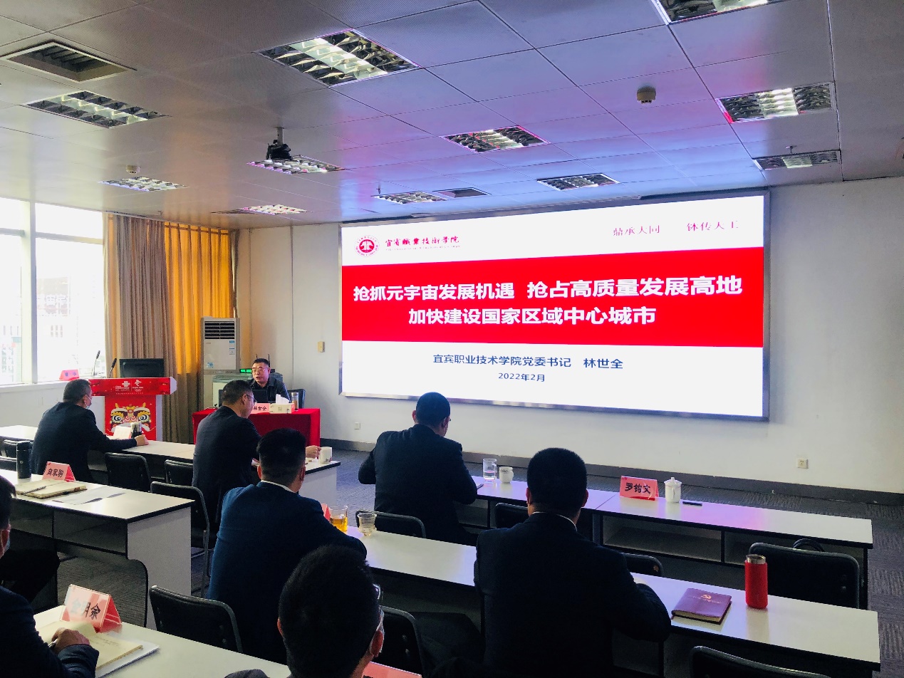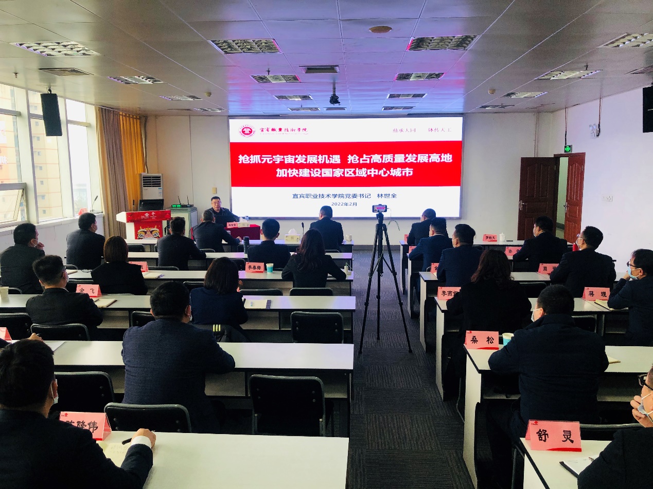 讲座上,林世全书记以《抢抓元宇宙发展机遇 抢占高质量发展高地 加快建设国家区域中心城市》为主题,围绕“宜宾现有的高质量发展基础”“元宇宙为什么对宜宾未来如此重要”和“关于宜宾抢抓元宇宙产业发展的几点思考”等三个方面作了详细阐述。一是介绍了宜宾在近五年的高质量发展坚实基础上,在国家区域发展战略中的地位日渐凸显、在国家经济地理版图中的地位不断提升、全国性综合交通枢纽将快速形成、产业结构转型升级效果加快显现、科教实力正在创新优势加快转化以及对外开放各类平台加快成熟等方面的重要发展成绩,突出了宜宾城市定位和未来良好发展前景。二是以“元宇宙是什么”引发大家从基础概念走向深入学习思考,着重阐述了元宇宙的发展历程、重要特征、应用领域、功能作用、深刻内涵和重要意义等内容,深刻认识到元宇宙是依托现实世界的数字虚拟世界,是各类前沿信息技术的矩阵式融合式创新,是数字经济的核心,引导大家认识到元宇宙与日常消费、教育、工作和生活服务等各方面紧密联系,从遥不可及的概念到触手可及的现实,引发深入探讨元宇宙的发展机遇和未来应用前景。三是以宜宾产业可持续发展的需要为前提,建议聚焦构建元宇宙产业体系,通过学习宣传、科学谋划、抢抓机遇,以项目为导向、以市场换投资,全力助推宜宾抢抓元宇宙产业发展机遇。