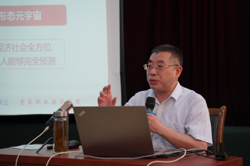 讲座上,林世全书记以《抢抓元宇宙发展机遇抢占人才培养高地 加快建设高水平现代职业院校》为主题,围绕“关于元宇宙的初步认识”“元宇宙对职业教育的影响”“抢先探索构建元宇宙职业教育高地”等三个方面作了详细阐述。一是深入解读“元宇宙是什么”,引导认识元宇宙的基本概念和本质含义,强调元宇宙是数据经济的核心,属于数字经济范畴。着重阐述了元宇宙的发展历程、重要特征、应用领域、功能作用和重要意义等内容,并批判解读了当前存在的一些片面错误的认识,由浅入深的引导全体干部教师认识元宇宙并不是脱离物理现实世界的独立空间,而是依托于物理现实世界的数字网络空间,其深度融入、紧密联系、改造提升日常工作学习和生活方式,启发了对元宇宙的发展机遇和未来应用前景的深入思考。二是以宜宾职院为例,从“需求决定供给”“技术革命引导教学革命”“资源共享”“高质量发展要素”“宜宾职院品牌塑造”和“宜宾职院重塑”等六个方面详细讲解了元宇宙对职业教育的重要影响。聚焦未来元宇宙产业发展前景、岗位需求和人才需求,充分发挥元宇宙对千行万业赋能作用,全力抢占元宇宙人才、投入和优质资源,聚力打造职业教育元宇宙平台,推动构建元宇宙技术技能人才培养体系、专业建设、课程设置和改革创新等,助力人才培养质量和办学实力的不断提升。三是明确提出元宇宙赋能学院实现新一轮高质量发展的具体工作措施。通过完善元宇宙赋能学院高质量发展的整体规划,学习宣传形成发展共识,先行先试共建全国首个元宇宙产业学院,夯实元宇宙产业体系技术技能人才基础,赋能“双高”建设和专业升本,以及推进重要项目落地落实等方式,全力抢占职教元宇宙平台。