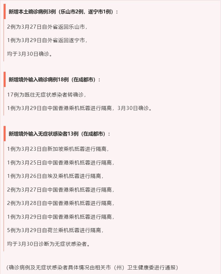 3月30日0时至24时,四川新增本土确诊病例3例,无新增本土无症状感染者,新增境外输入确诊病例18例(其中17例为既往通报的无症状感染者转确诊),新增境外输入无症状感染者13例,新增治愈出院病例11例,无新增疑似病例,无新增死亡病例。