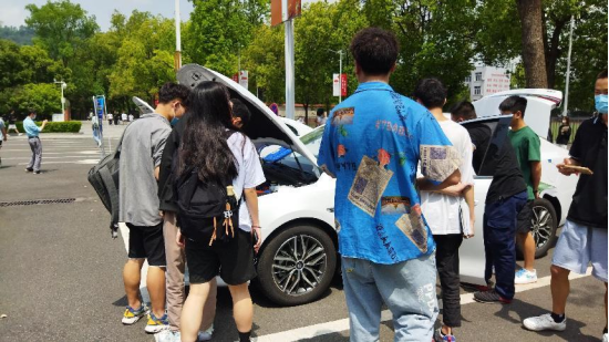 活动现场氛围热烈,吸引了众多学生驻足观看和体验,同学们在每辆车前,认真观察结构,积极地和志愿者们交流,了解汽车新科技、新技术、新理念,志愿服务的学生也认真的解答,做好宣讲。