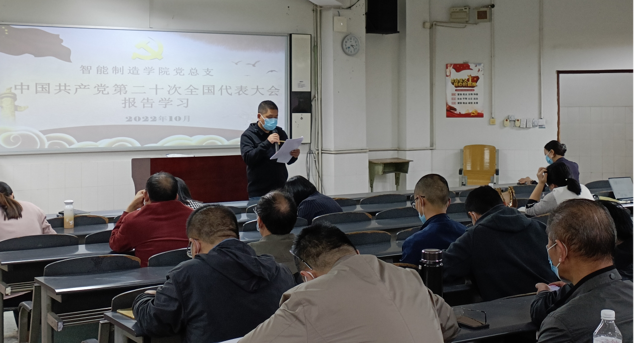 10月26日下午,智能制造学院党总支组织全体教职员工在教学楼1116教室集中学习研讨党的二十大报告。会议指出,要全面、系统、深入学习党的二十大报告,切实把思想和行动统一到党的二十大精神上来,把智慧和力量凝聚到全面落实党的二十大作出的各项决策部署上来,把学习成果转化为全方位推动学院高质量发展的强大动力,为党育人,为国育才。