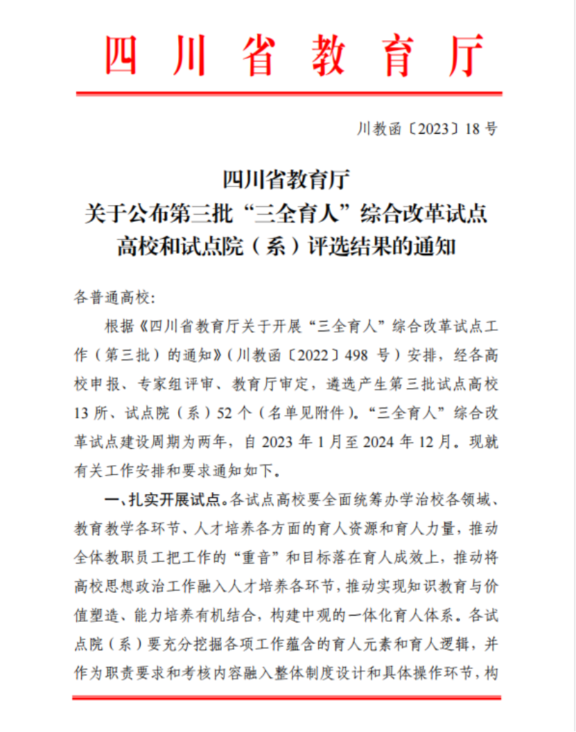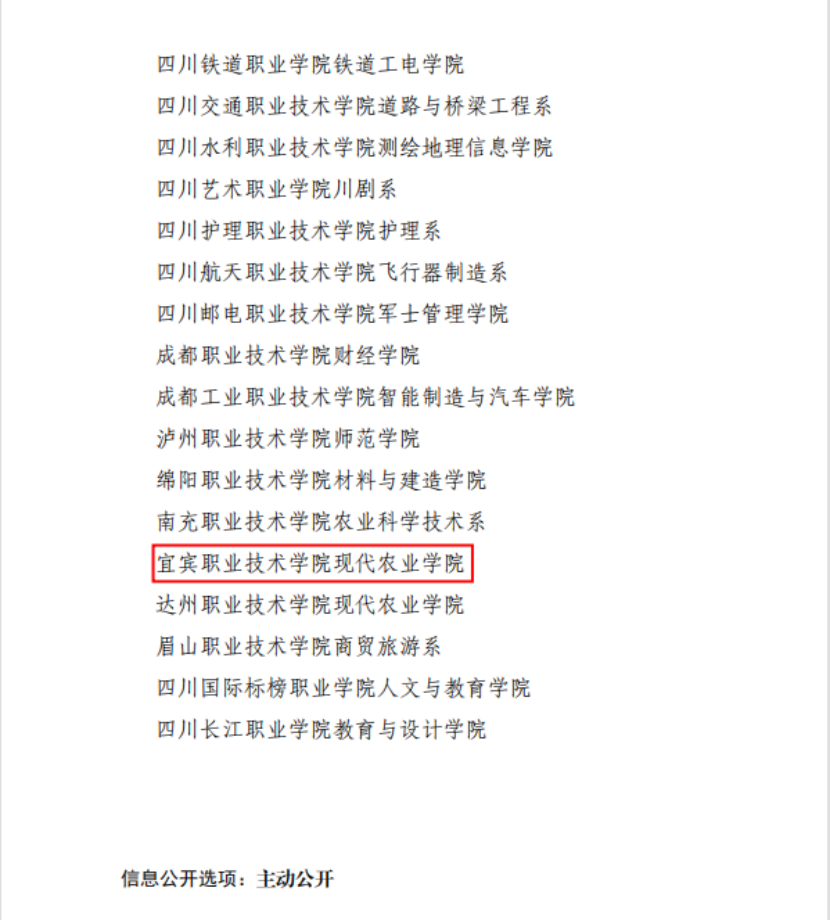 近日,从《四川省教育厅关于公布第三批“三全育人”综合改革试点高校和试点院(系)评选结果的通知》获悉,我院现代农业学院以《“七彩大地 人人出彩”——中国式现代化视域下高职院校涉农类专业“三全育人”创新与实践》成功入选四川省第三批“三全育人”综合改革试点院(系)。截至目前,我院已入选省“三全育人”综合改革试点高校和三个试点院(系)。