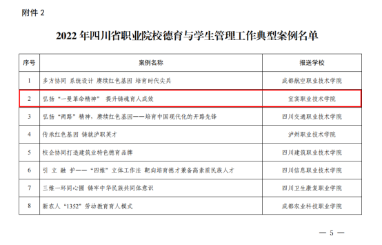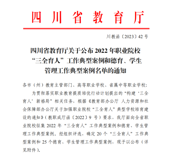 近日,从《四川省教育厅关于公布2022年职业院校“三全育人”工作典型案例和德育、学生管理工作典型案例名单的通知》获悉,我院案例《实践产教融合 探索“校企合作双元育人”新模式》成功入选2022年四川省职业院校“三全育人”工作典型案例,《弘扬“一曼革命精神” 提升铸魂育人成效》成功入选2022年四川省职业院校德育与学生管理工作典型案例。