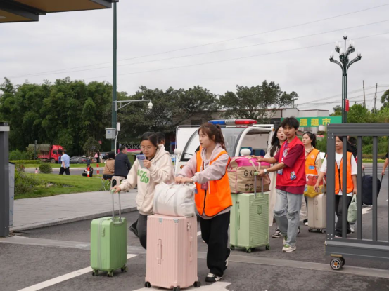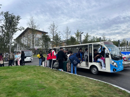 为实现学生报到全程“零负担”,12辆“小白龙”运输车在新校园内循环运行,供学生免费乘坐、运送行李。来自学院团委的70余名学生志愿者和多名二级学院的志愿者们提前到达工作岗位。迎新接站、行李搬运、校园引导、注册报到、答疑解惑,“红马甲”们活跃在校园的每个角落,仅7日一天接待了近2万人次。学院基建后勤处在供水供电、餐饮服务、场地布置等方面全力保障,学生食堂在7日接待用餐8000人次以上。