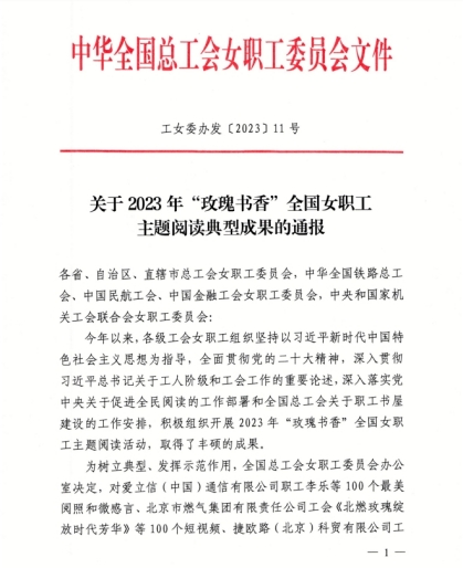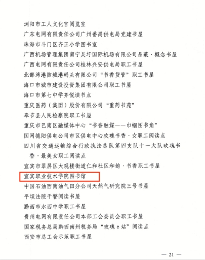 近日,中华全国总工会女职工委员会办公室公布了2023年“玫瑰书香”全国女职工主题阅读典型成果名单,宜宾职业技术学院图书馆获评全国总工会“玫瑰书香•最美女职工阅读点”,全宜宾市仅两家单位获此殊荣。