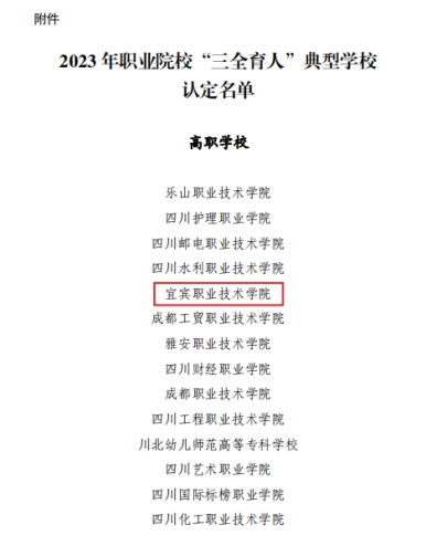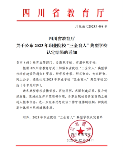 近日,四川省教育厅公布了2023年职业院校“三全育人”典型学校认定结果,经学院申报、形式审查、专家评审、网上公示等环节,我院被遴选认定为2023年职业院校“三全育人”典型学校。