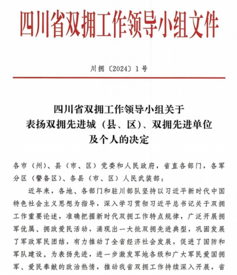 近日,四川省双拥工作领导小组通报表彰了第十二届四川省双拥先进城(县、区)、双拥先进单位及个人,我院被授予“四川省拥军优属先进单位”荣誉称号。