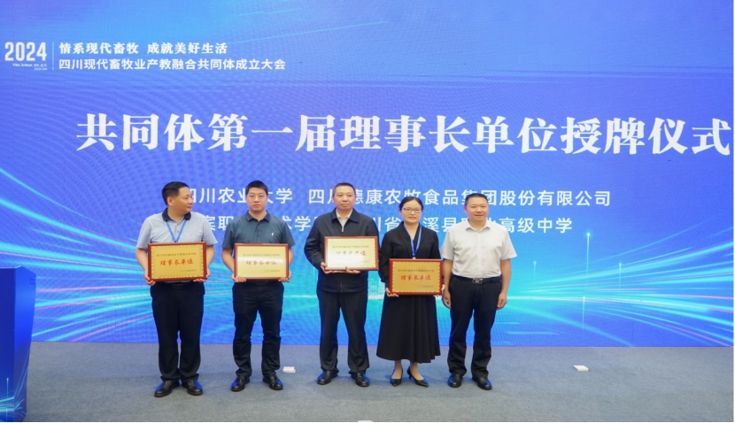 吴勇刚宣布共同体第一届理事长、副理事长、秘书长、理事单位名单,参会领导为上述单位授牌。我院当选第一届四川现代畜牧业产教融合共同体理事长单位。