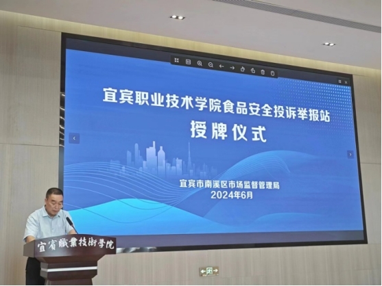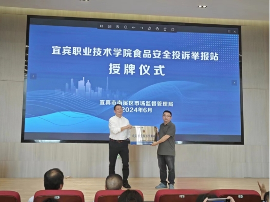 南溪区市场监管局副局长周兵宣读了关于成立宜宾职业技术学院食品安全投诉举报站的文件。王琮为宜宾职业技术学院食品安全投诉举报站授牌,并明确了投诉站职责和工作要求。