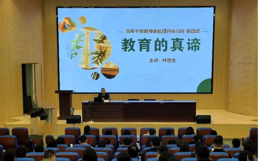 12月5日下午,党委书记林世全为青年干部教师素能提升研习班全体学员作题为《教育的真谛》的第四期讲座。