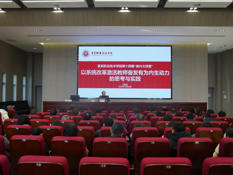 12月26日下午,宜宾职业技术学院第十四期“鼎兴大讲堂”在勤勉楼231报告厅开讲。我院特邀嘉兴市人民政府咨询委员会副主任、嘉兴职业技术学院原党委书记方俊良研究员作题为《以系统改革激活教师奋发有为内生动力的思考与实践》的专题讲座。学院党委常委、组织部部长陈敏主持。