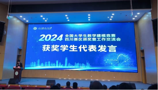 本次会议由全国大学生数学建模竞赛四川赛区组委会主办,四川轻化工大学承办。我院指导老师团队带领四川省一等奖团队成员于天吉、饶在权、陈浩参会。数理教研室主任王晓平代表指导老师团队上台领奖。陈浩同学作为四川省高职高专组学生代表在会上作交流发言。
