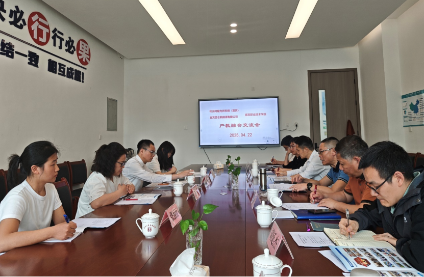 为进一步深化产教融合,共筑新能源技能人才培育新高地,4月22日下午,光伏新能源企业产教融合交流会在新能源电池学院举行。和光同程光伏科技(宜宾)有限公司人力资源部经理田江、宜宾昆仑新能源有限公司人事资源部经理杨利、学校党委书记伍小兵、新能源电池学院院长陈泽华出席会议。会议由新能源电池学院党总支书记先元华主持。