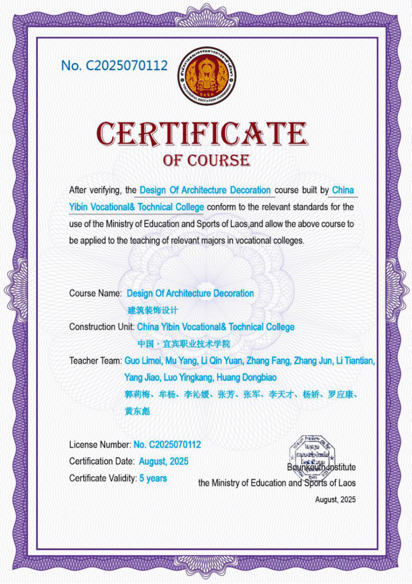 近日,我校服务共建“一带一路”倡议取得重大突破,由建筑与环境学院历时五年开发建设的《建筑装饰设计》课程,正式通过老挝人民民主共和国教育和体育部认证,标志着中国职业教育标准成功走向世界。这一成果为打造具有国际影响力的职教品牌、推动职业教育高水平对外开放树立了新标杆。