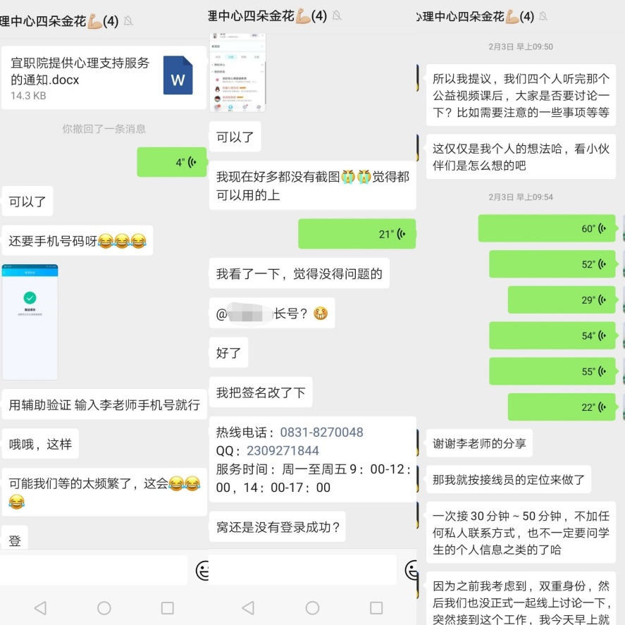 在教育部1月29日下发《关于针对新型冠状病毒感染的肺炎疫情开通心理支持热线和网络辅导服务的通知》的指导下,学生处牵头开通了学生心理支持网络服务,安排专人负责心理支持电话热线与QQ热线,保证每天9:00--17:00热线畅通,使有需要帮助的学生主动得到及时辅导服务。同时要求热线工作者积极收听抗疫心理公益课程并鼓励大家讨论热线工作相关事宜等,不断提升与优化热线服务工作的质量,为我校学生搭建一个有温度、有热度的网络心理服务平台!并于2月2日下发了《宜职院提供心理支持服务的通知》。