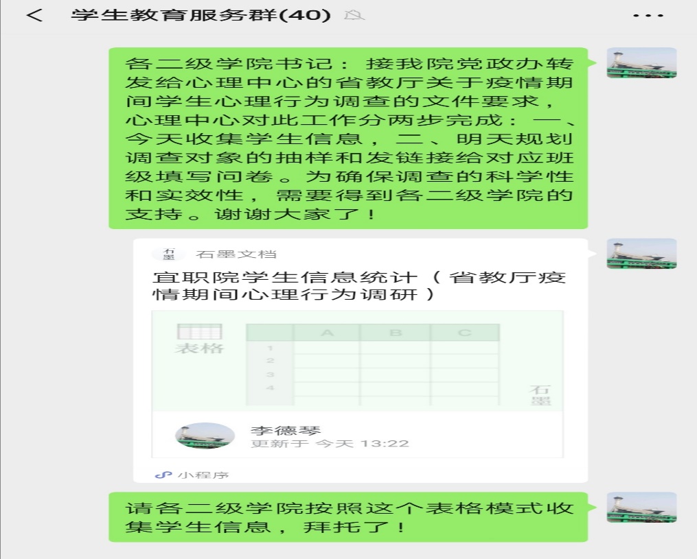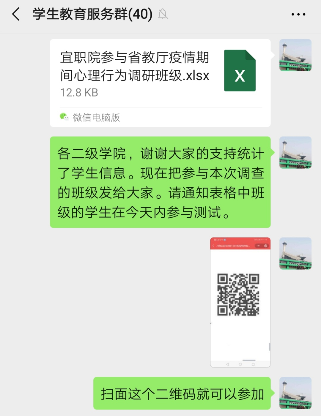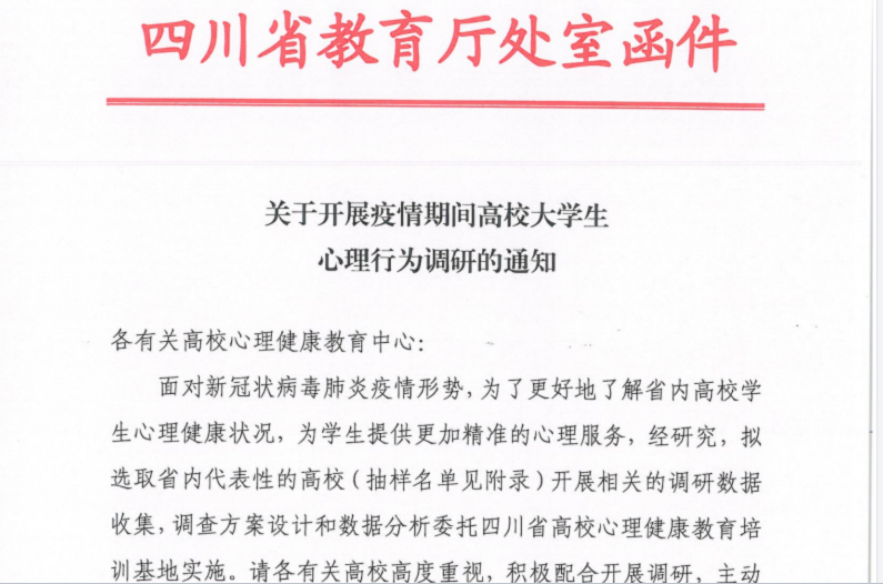 我院积极配合四川省教育厅宣传思想与统战工作处开展疫情期间高校大学生心理行为调研工作。为确保此次调研工作的调查取样具有代表性,学生处心理健康教育中心会同各二级学院收集了学生的年级、专业、专业性质、男女生等信息,然后抽取了35个专业的1763名同学参与调研,其中男生1059名,女生704名。各二级学院的领导高度重视,及时安排部署工作,辅导员认真组织学生填写,确保了此项工作的顺利完成。