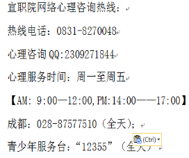 (1)电话热线、网络QQ咨询,校园个别辅导、医院专科门诊(宜宾市第二人民医院总院睡眠心理门诊、心理咨询门诊,南区心理治疗 心理咨询,临港院区睡眠心理科、心理咨询和治疗门诊;第四人民医院精神障碍门诊、睡眠情绪门诊、医学心理咨询与治疗门诊。)