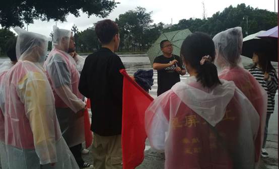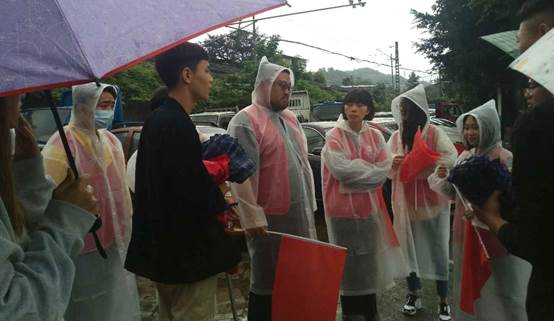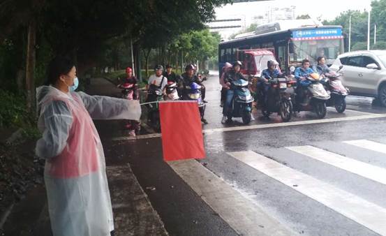 清晨7点钟,参加翠柏大道高庄桥至水井段交通文明劝导和卫生巡查值守的十多名宜职院大二、大三学生,便在带队老师带领下早早的来到高庄桥笋子厂站附近聚集点。他们内穿红色志愿服,外披雨衣,在社区工作人员和老师指导下分工定点,职责明确,井然有序地开展自己的义工工作。在社区街道、居民小区、公交站牌、公路路口及人行道上,随处都可看见志愿者们忙碌的身影。他们有的手持扫把撮箕,认真地清扫地面积水和垃圾;有的手执红色小旗,严格地指挥过往车辆和行人,有的笑容可掬,往来协助乘客上下公交车。尽管天上秋雨淅沥,地面积水绵延,但只要身穿红色志愿服的师生走到哪里,哪里就成为阴雨中的一道亮丽风景。