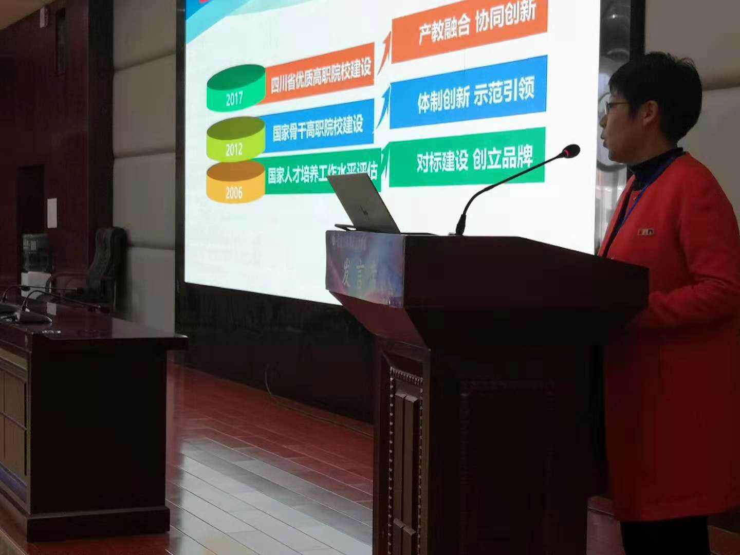 2018年11月3日,围绕“脱贫攻坚,同步小康”为主题的中国.云贵川渝2018职业教育发展论坛在贵州建设职业技术学院举行,中国职业教育学会常务副会长刘占山、《中国职业教育杂志社》主编唐以志等及来自三省一市教育行政部门和职教学会的领导,职业院校、行业企业的嘉宾及主流媒体共300多人齐聚多彩贵州,我院党委委员、副院长闫景丽同志代表四川省高职高专院校参加此次论坛。
