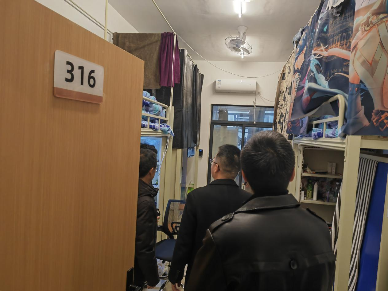 廖益均一行实地考察了校园警务站、消防控制室、技防控制室,并看望慰问了老挝籍留学生,走访调研了留学生寝室、教工食堂(假期留校学生就餐区)、梅影阁超市,详细听取了涉及假期留校学生学习、生活、安全的校园消防技防、警务站建设、食堂及档口食品卫生等情况介绍,给学校寒假前校园安全稳定工作提出了宝贵建议,为学校安全稳定发展送上了深切的关怀。