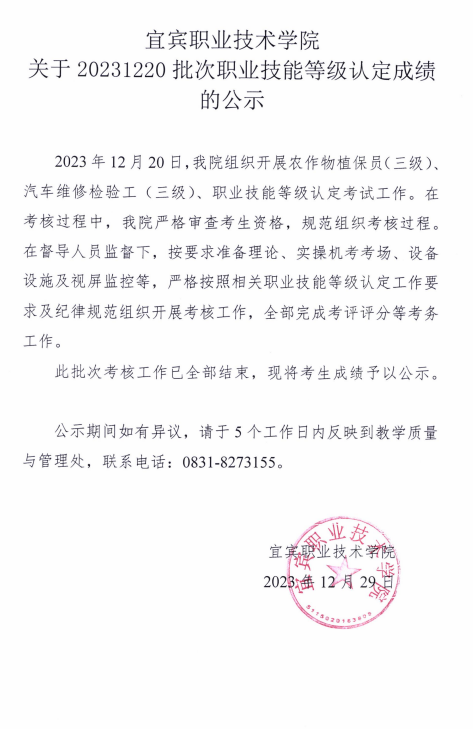 上一条:关于20231227批次职业技能等级认定成绩的公示 下一条:宜宾职业技术学院职业技能等级认定公告(2024年第1批次)