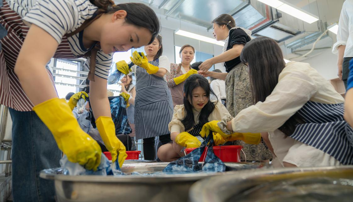 在扎染非遗传承人李启淑的指导下,中老学生分组创作了扎染作品。浸染、氧化、拆线的过程中,两国青年围绕图案设计与染料配比热烈交流。李启淑表示:“跨国文化碰撞为非遗技艺注入新活力,这正是传承的意义所在。”