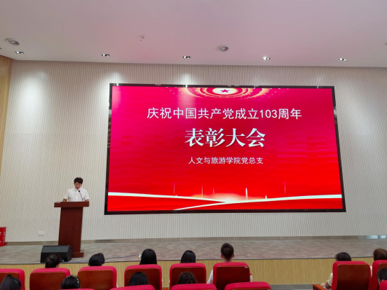 7月1日下午,人文与旅游学院庆祝中国共产党成立103周年表彰大会在崇信楼117隆重举行。党总支书记李璟,受表彰的优秀党员和优秀党务工作者,全体党员、预备党员等参加活动,活动由党总支副书记杨维达主持。