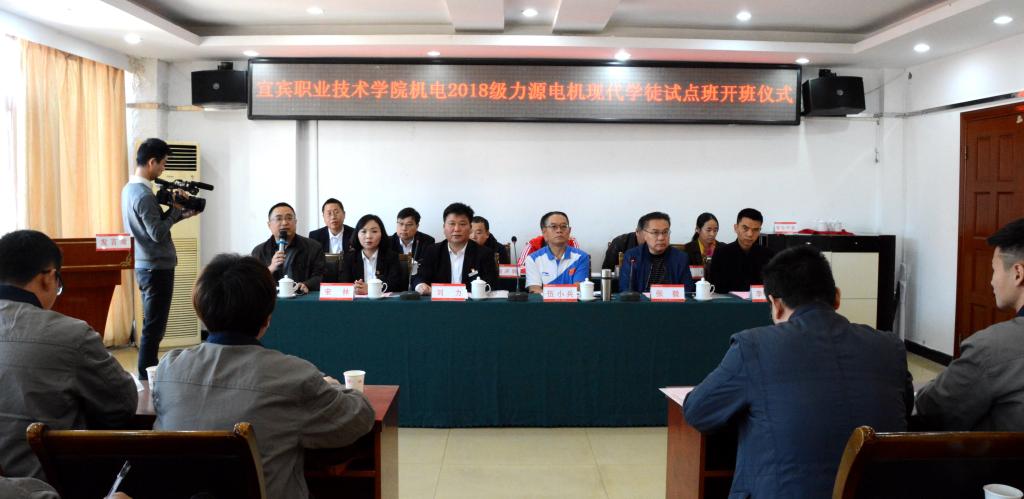 院长伍小兵在开班仪式上对力源电机给予我院的支持表示感谢,同时表示,根据党的十九大精神和全国教育大会精神,国家将大力发展职业教育、完善职业教育培训体系,深化产教融合、校企合作,而我院现代学徒制试点作为实现校企产教融合的一种有效途径,通过力源电机学徒制试点班这个载体,通过校企共建共育、产学研交融、技术技能共建共享等途径,一定能高效推进校企双主体办学模式,构建起宜宾职院和力源电机的命运共同体,全面提升人才培养质量,全面推进我院与力源电机的共同发展,为宜宾区域制造业培养更多的技能人才,为“中国制造”宏伟目标的实现培养出更好的“大国工匠”。同时他也提出了几点希望,一是希望校企双方,坚持教育为人民服务、为中国共产党治国理政服务、为巩固和发展中国特色社会主义制度服务、为改革开放和社会主义现代化建设服务的方针,将学生培养成为德智体美劳全面发展的新时代建设者和接班人;二是希望同学们树立共产主义远大理想和中国特色社会主义共同理想,增强中国特色社会主义道路自信、理论自信、制度自信、文化自信、立志肩负起民族复兴的时代重任,努力提高自己的技术技能水平,早日成为企业的技术骨干。会议在伍小兵院长宣布机电2018级力源电机现代学徒试点班正式开班后圆满结束。
