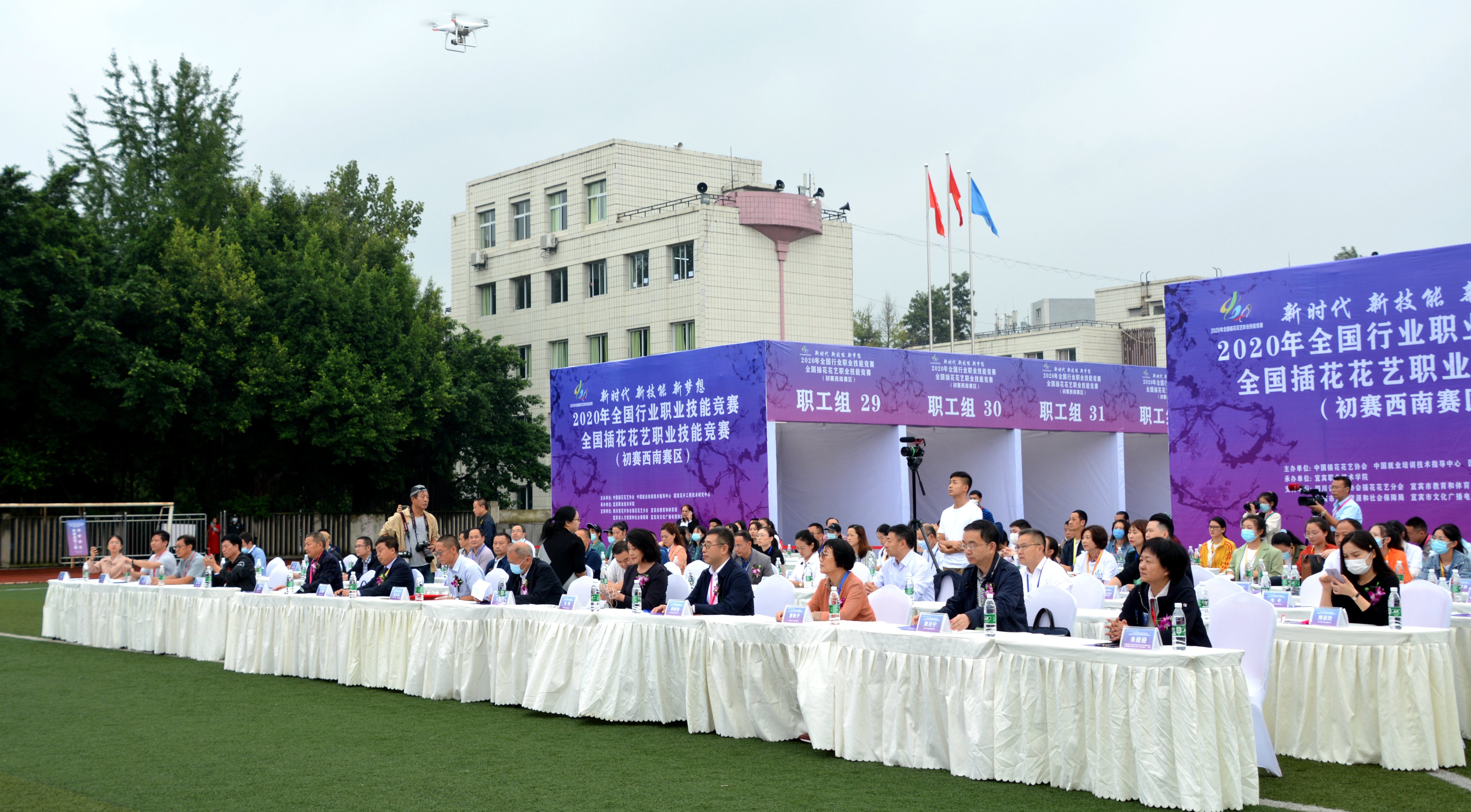 9月21-23日,天色灰暗,细雨绵绵。宜宾职业技术学院运动场上却披红挂彩,洋溢着节日的气氛。为期三天的2020年全国行业职业技能竞赛插花花艺职业技能竞赛西南赛区初赛正在这里悄然进行,来自四川、重庆、云南、贵州、西藏的90位选手紧张有序地在各自的工位上参加比赛。